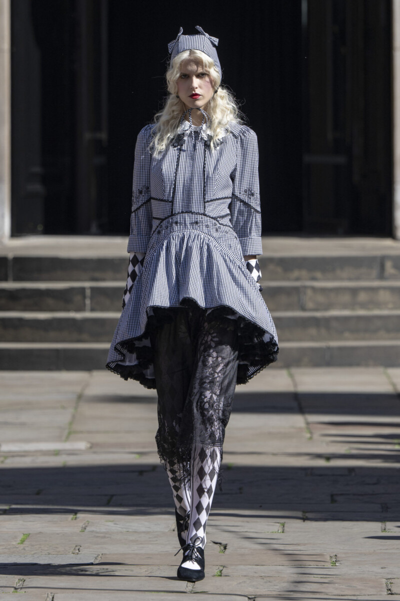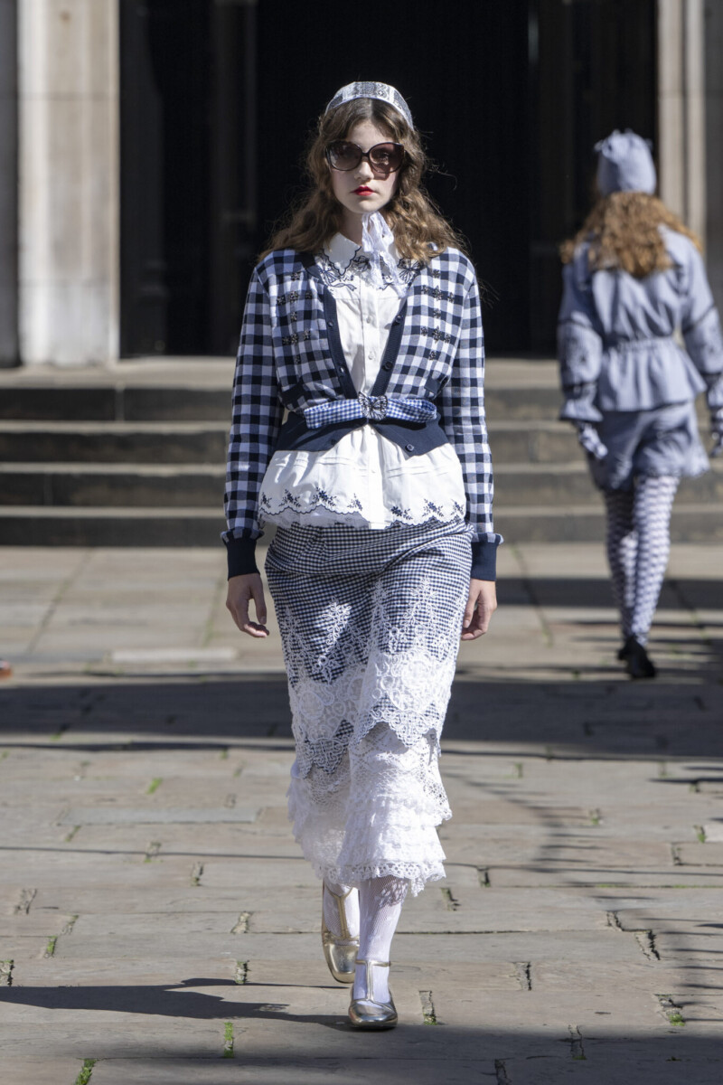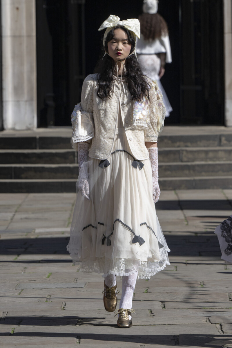 The collection drifts between childlike innocence and mature melancholy. Slimline dresses are softened with lace trims, butterflies and flowers embroidered gently across bodices, and gingham transformed into sheer overlays. Asymmetry, layering, and transparency convey vulnerability while introducing unexpected modernity. Raw edges and delicate cut-outs echo porcelain cracks, shaping silhouettes that balance ethereality with endurance.