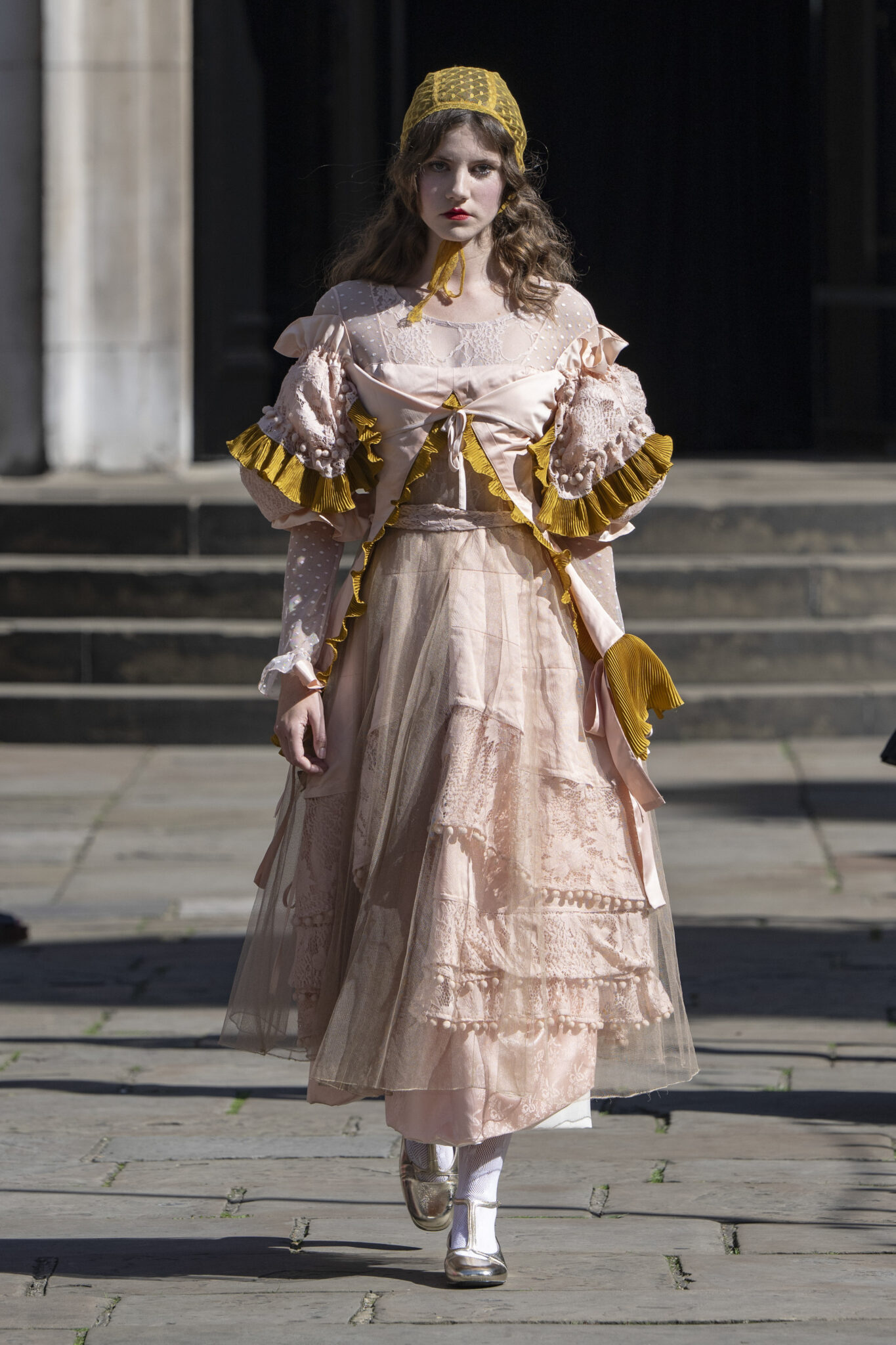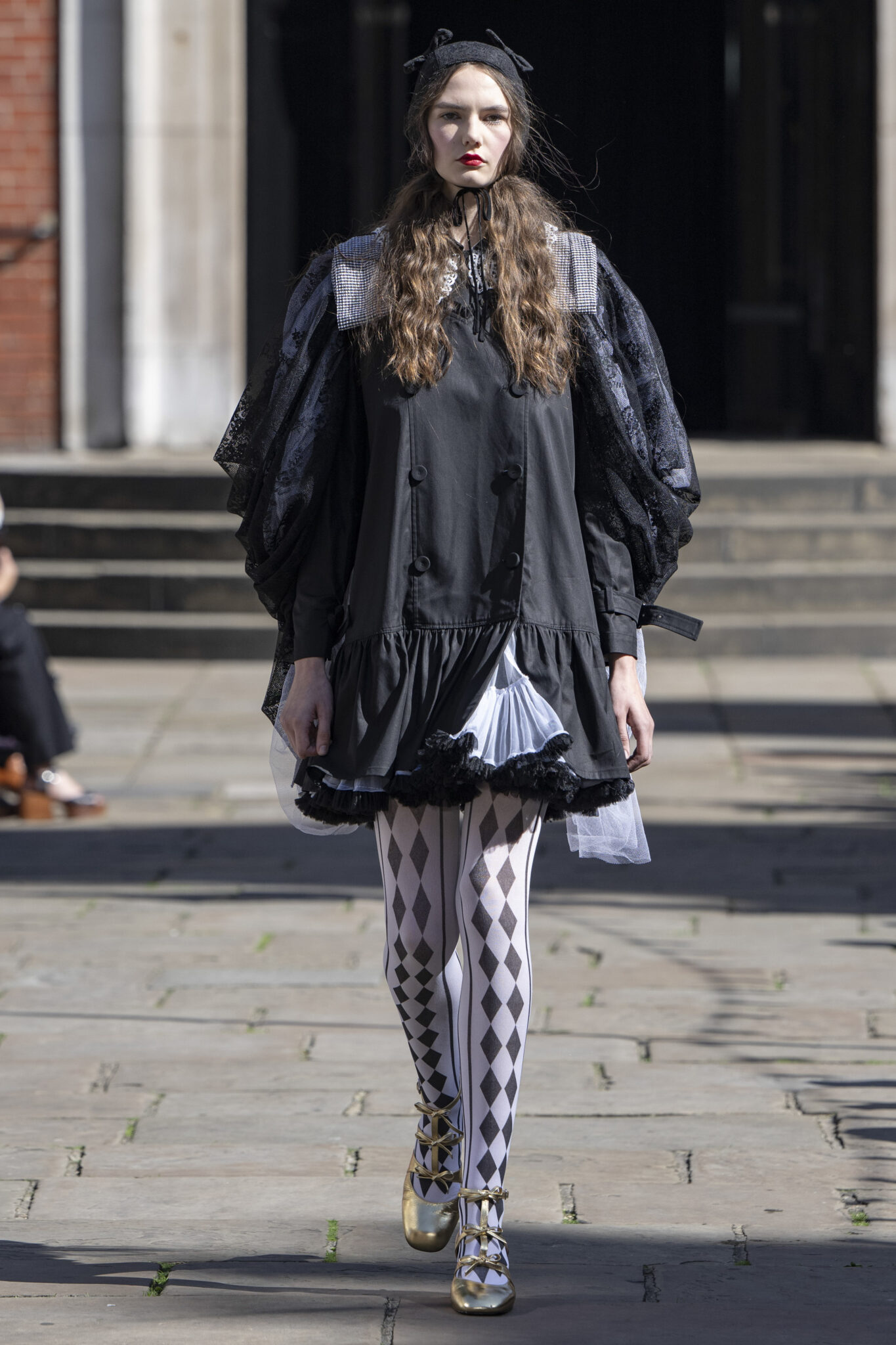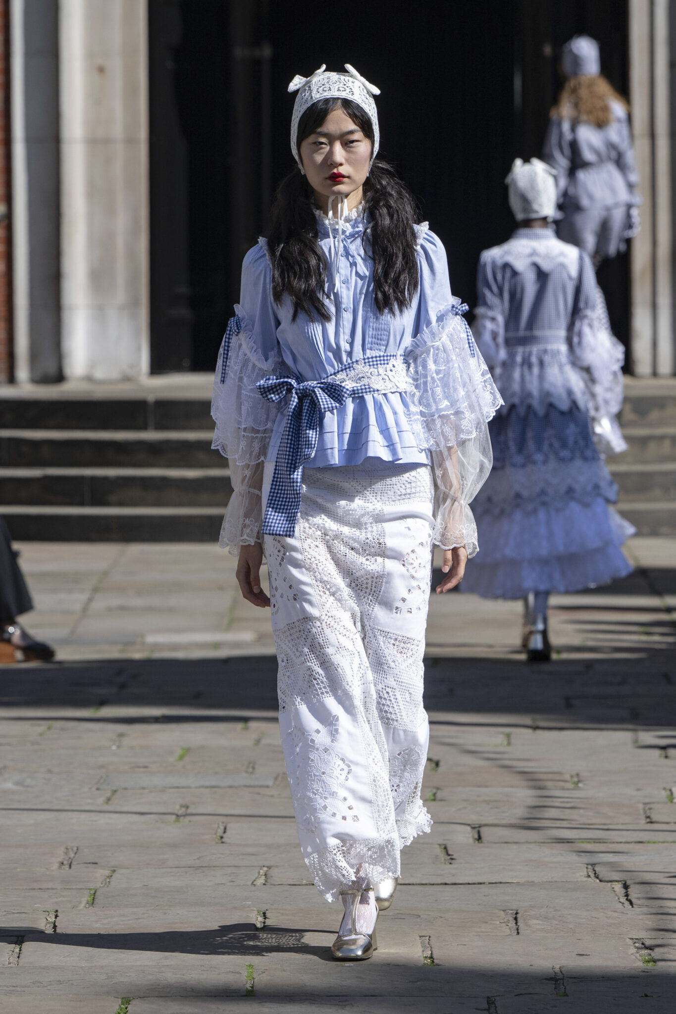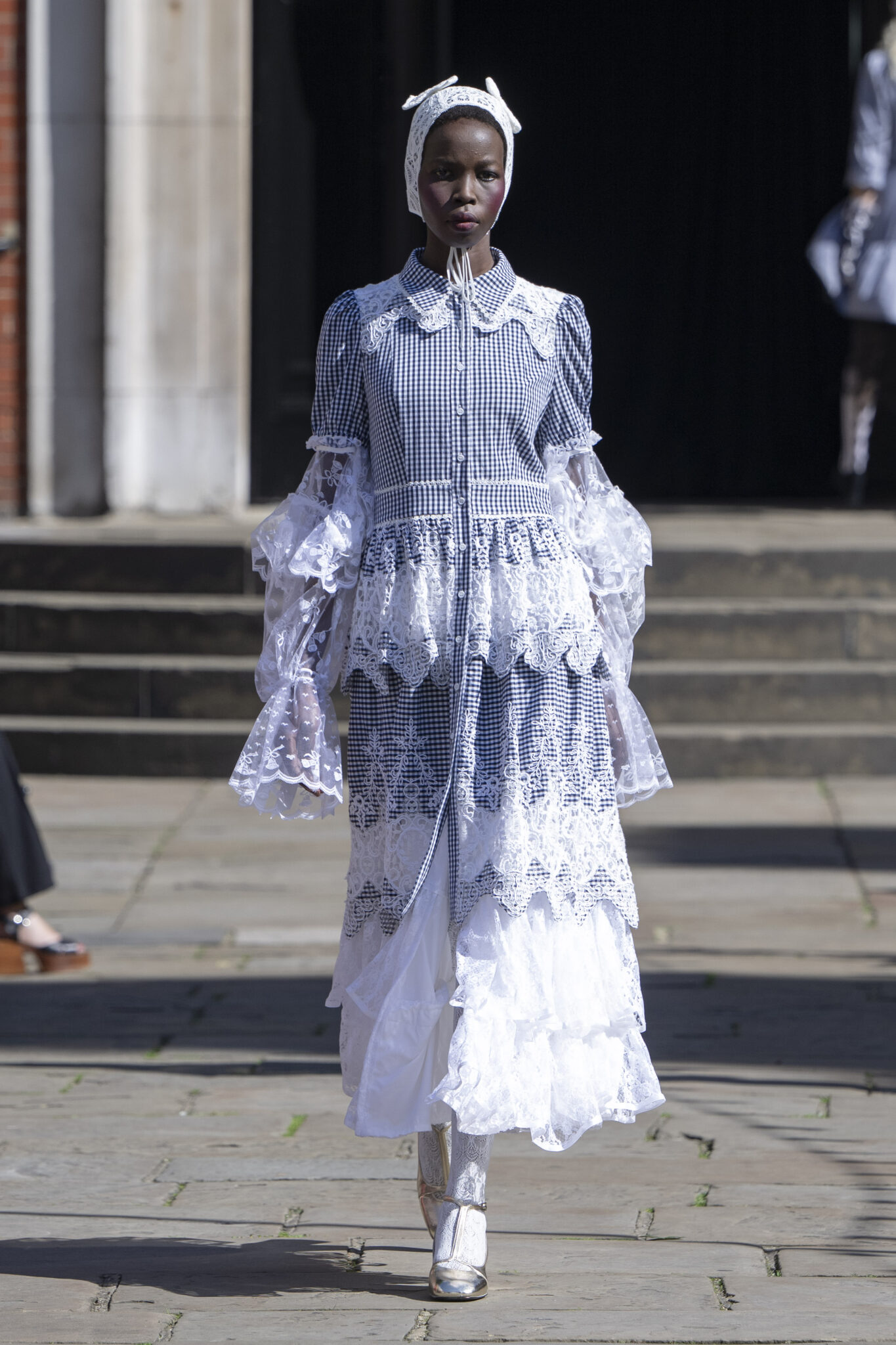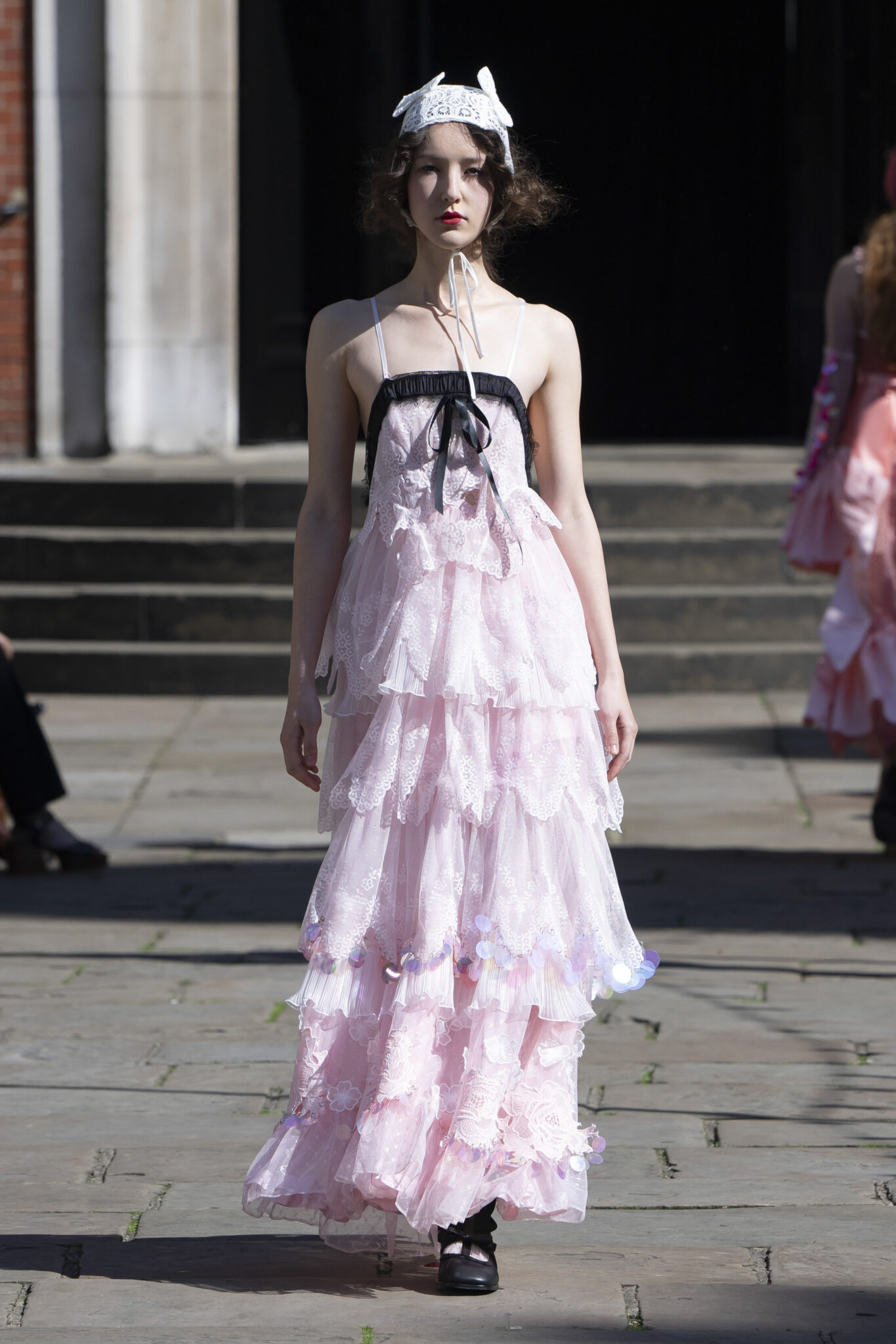 The collection drifts between childlike innocence and mature melancholy. Slimline dresses are softened with lace trims, butterflies and flowers embroidered gently across bodices, and gingham transformed into sheer overlays. Asymmetry, layering, and transparency convey vulnerability while introducing unexpected modernity. Raw edges and delicate cut-outs echo porcelain cracks, shaping silhouettes that balance ethereality with endurance.