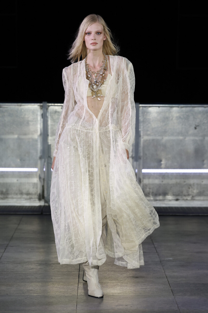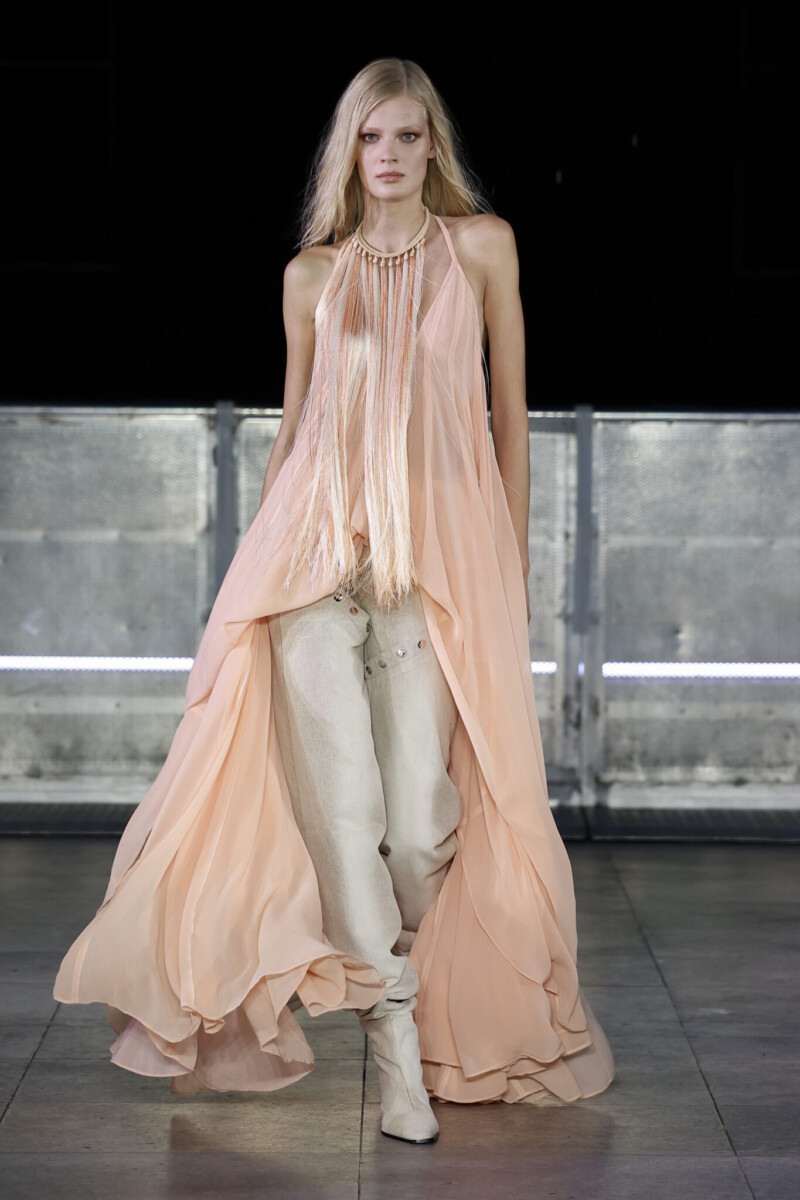 A palette of pale stone, frosted pink, muted yellow, cream, and nude recalled glass smoothed by years of ocean waves. Each look reflected metamorphosis: fragility reshaped into strength, armour transformed into allure.